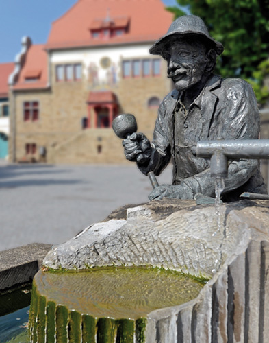 | 4 Steinmetz-Brunnen Im Zuge der Neugestaltung der Ortsmitte wurde 1997 die Idee eines Dorfbrunnens verwirklicht, mit dem die Odenheimer an ihr einst blühendes Steinhauergewerbe erinnern wollen. Die Figur ist dem einstigen Steinhauer und Dorforiginal Franz Schäfer nachempfunden. |