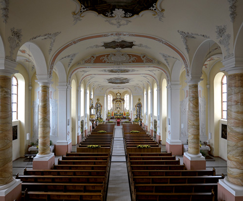 | 9 Katholische Kirche Mit ihrem 65 m hohen Turm ist die Pfarrkirche St.Michael weithin sichtbar. Um 1200 erstmals als romanische Kirche erwähnt. Der 1776/1778 errichtete Barockbau wurde 1909/1911 im Westen durch einen neobarocken Anbau erweitert. Die sakrale Ausgestaltung stammt ursprünglich von den Odenheimer Gebrüdern Hemberger (Kunst- und Kirchenmaler). 1998 Renovierung und Neugestaltung der Seitenaltäre und der Taufkapelle. Die Orgel aus dem Jahr 1912 (36 Register) hat eine „romantische Disposition“ und ist durchaus denkmalwürdig. |